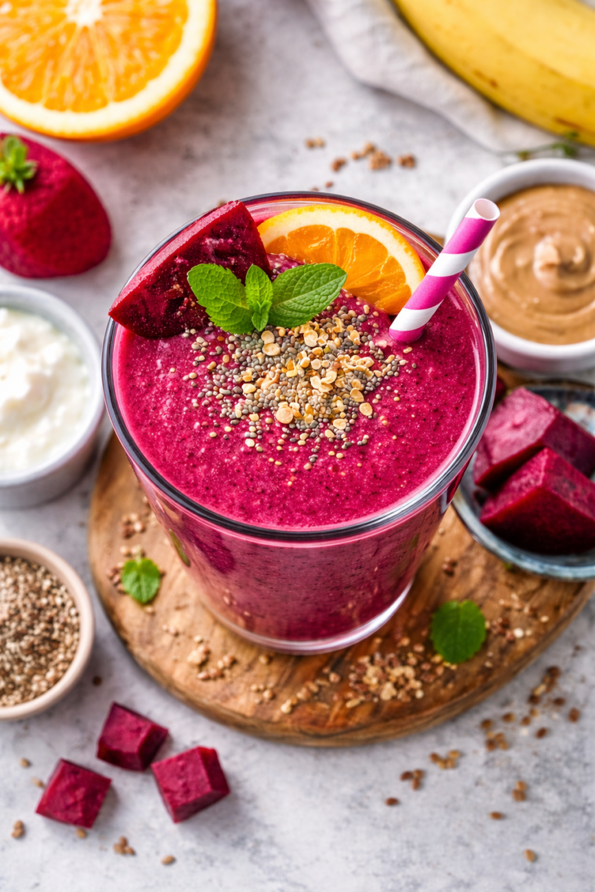 Są takie dni, kiedy masz ochotę na coś słodkiego, ale jednocześnie chcesz zjeść normalny, porządny posiłek – i wtedy ten koktajl z buraka sprawdza się idealnie. To gęste, kremowe smoothie łączy w sobie owoce i warzywa w najprostszej możliwej formie: wrzucasz składniki do blendera i po chwili masz gotowy napój, który syci na długo. Ugotowany burak nadaje mu intensywny kolor i lekko ziemisty posmak, który świetnie „zaokrąglają” banan i pomarańcza. Jogurt grecki odpowiada za kremowość, a masło orzechowe dodaje głębi smaku oraz przyjemnej, deserowej nuty.