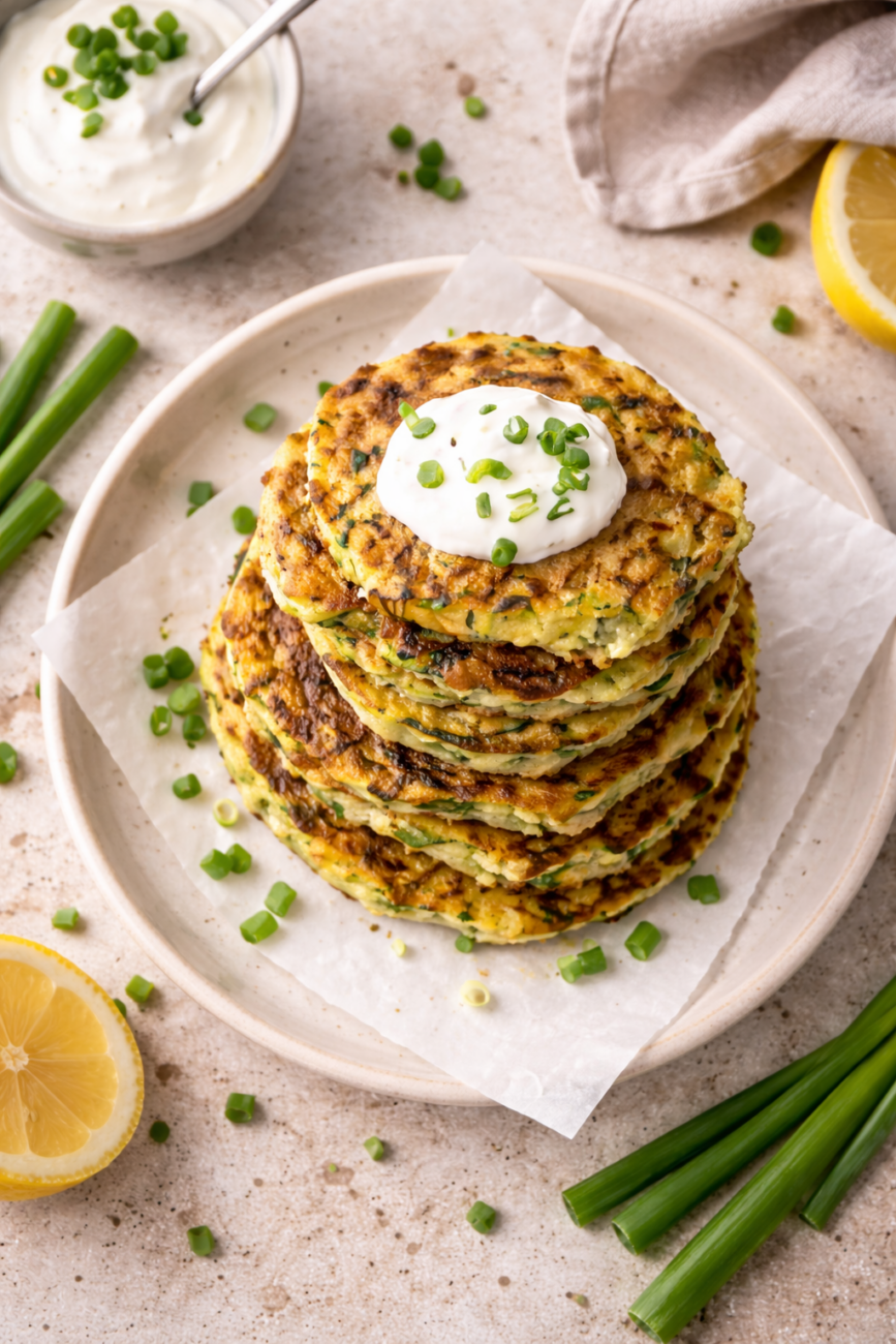 Najlepsze w tym przepisie są kontrasty. Z zewnątrz chrupiące placki z cukinii mają złocistą, wyraźnie przypieczoną skórkę, a w środku pozostają miękkie, soczyste i aromatyczne. Smak jest wyważony — delikatny, ale nie nijaki, z lekką wytrawnością i przyjemną głębią, która sprawia, że jeden placek to zawsze za mało. To nie są ciężkie, tłuste placuszki z cukinii, tylko wersja, do której chce się wracać, bo po prostu dobrze się ją je.